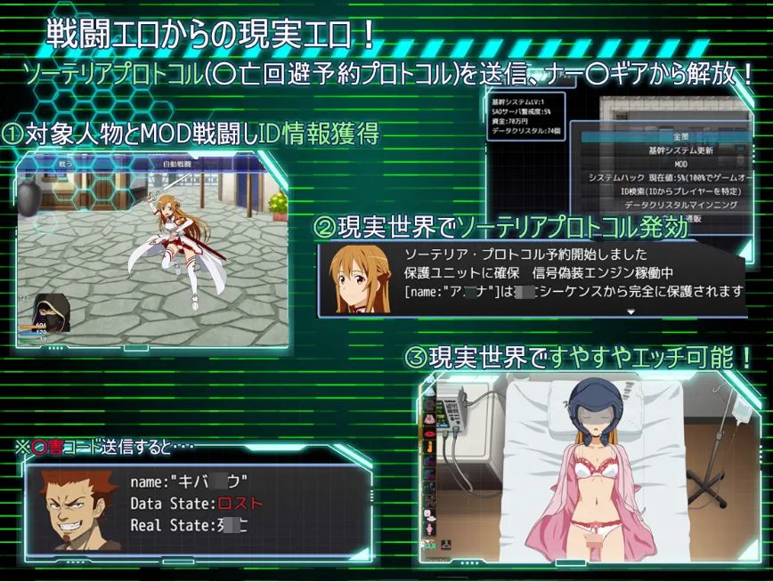 剧情就是在游戏里套出各种女主角色的现实情报【套取情报过程就是回合制战斗,边打边战斗H】,然后偷摸跑到现实中玩弄那些陷在游戏世界出不来,现实中是个植物人的女主们】,这应该算是触摸互动睡眠奸游戏为主!