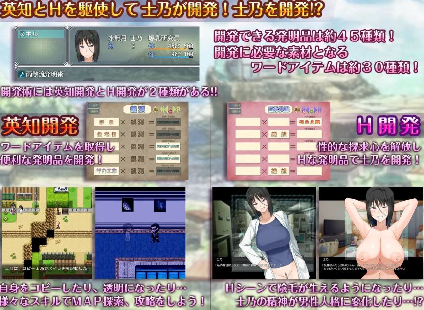 士乃终于开始用自己的身体做起了实验。随着「兴趣等级」的提高,她对自己的身体有了更多的认识,开始感到背德的快感,渐渐地对开发H道具和技能沉迷了……