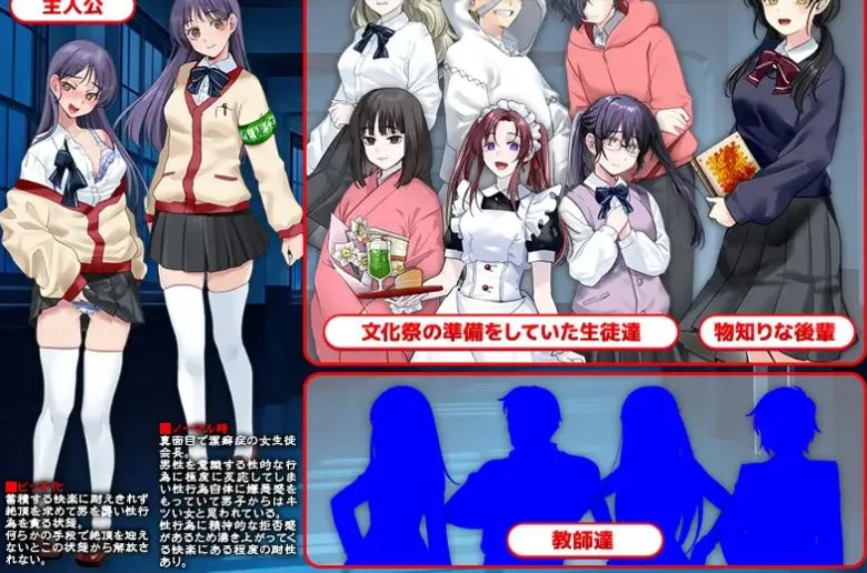 【被困的人们】■认真且洁癖的女生会长对涉及男性的性行为极度敏感,对性行为本身抱有厌恶感,被男生认为难以接近因精神上对性行为的抗拒,她对其他学生体内翻涌的快感具有一定抵抗力■主人公(荡妇化)无法积累的快感驱使下,为追求高潮而袭击男性、贪婪求欢的状态除非通过某种方式达到高潮,否则无法从这种状态中解放